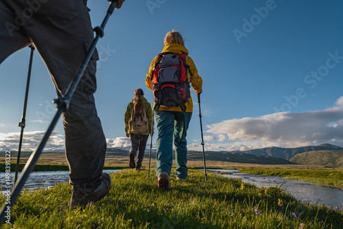 hiker, group, team, trekking, hiking, walking, trail, route, journey, adventure, mountain, alpine, peak, meadow, field, green, nature, wilderness, landscape, water, golden hour, sunset, dusk, warm light, blue skies, cloud, scenic, panoramic, colourful, clothing, gear, equipment, backpack, pole, stick, boot, footwear, summer, travel, exploration, ecotourism, leisure, recreation
