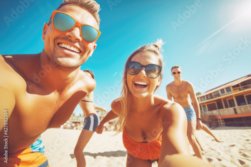 A group of young friends playing beach volleyball and having fun together on a summer holiday