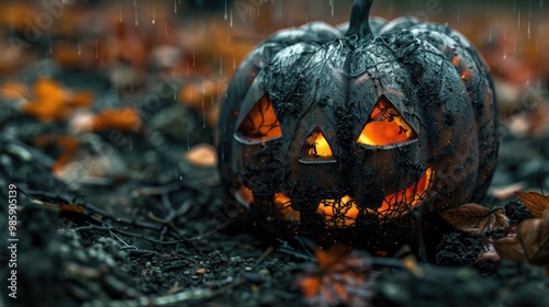 halloween, pumpkin, fall, autumn, rain, wet, stormy, weather, seasonal, decoration, harvest, festival, skittish, creepy, supernatural, eerie, atmosphere, misty, grey, sky, nature, garden, yard