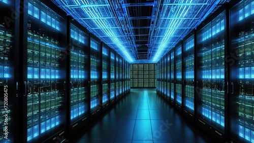 A hallway in a server room with servers.The image represents the vast amounts of data generated and stored in the digital world, highlighting the importance of data management and storage solutions.