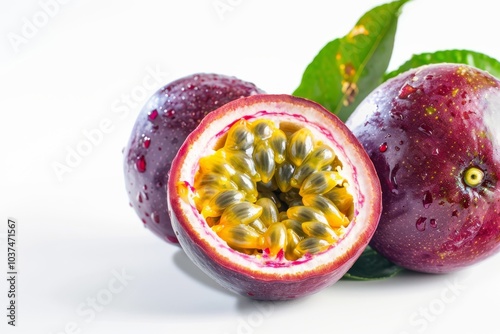 A halved purple fruit with juicy seeds is placed on a white surface. Concept of fresh, exotic food. For food blogs or recipe books.