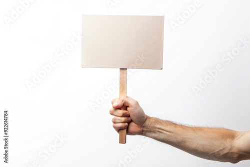 A hand holding a blank sign on a wooden stick, isolated on a white background. This image symbolizes protest, demonstration, message, communication, and blank space for your text.
