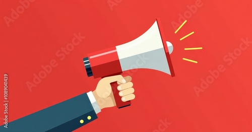 megaphone, hand, colourful, communication, announcement, promoting, speaker, loudspeaker, marketing, media, advertisement, notification, sound, speech, message, vocal, rally, campaign, attention, event, alert, noise, expression, engagement, performance, audio, voice, illustration, design, red background, graphic design, creativity, influence, sharing