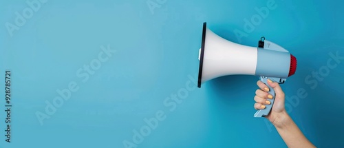 megaphone, hand, blue, background, announcement, speak, loud, voice, communication, attention, message, information, advertising, marketing, promotion, event, speaker, sound, amplification, broadcast, microphone, public address, loudspeaker, bullhorn, illustration, object, icon, business, three-dimensional, woman, shouting, shout