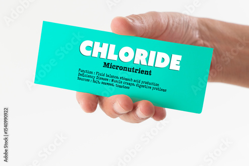 A hand holding a paper displaying key facts about Chloride as an essential micronutrient for human health, highlighting its functions, deficiency effects, and common sources