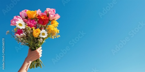 flower, bouquet, tulip, daisy, pink, white, sky, blue, hand, nature, celebration, floral, spring, bloom, blossom, outdoors, bright, cheerful, love, romantic, fresh, colourful, summer, gift, beauty, greenery, light, season, happiness, joy, delicate, fragrant, uplifting, natural, serene, positive, sunlight, vibrant, peaceful, skyward, elegant, flora, bunch, birthday, greeting, anniversary, background