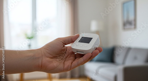 A hand holds a smart home device, highlighting modern technology for a connected home.Concept of smart home technology and automation.