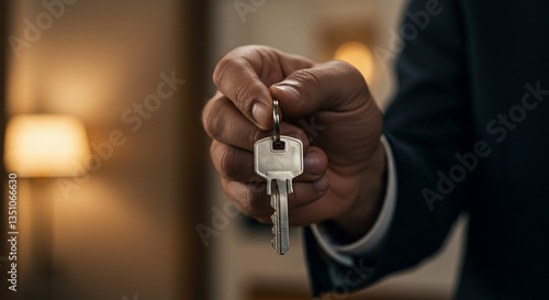 A hand offering house keys, symbolizing new beginnings and the excitement of homeownership, under soft, warm interior lighting.