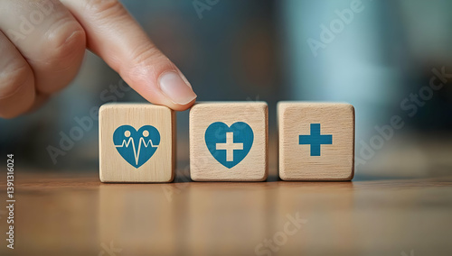 A hand pointing at wooden blocks with health symbols, illustrating wellness, care, and medical concepts in a modern setting.