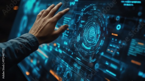 futuristic, technology, digital, interface, screen, hand, touch, glowing, blue, swirl, pattern, innovation, future, abstract, concept, design, datum, network, science, progress, modern, computer, virtual, reality, ai, artificial, intelligence, web, online, app, development, graphic, information, business, corporate, networking, connection, global, earth