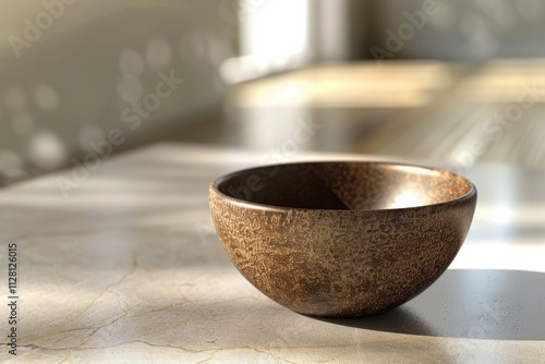 A handcrafted wooden bowl placed on a marble table catching soft afternoon light