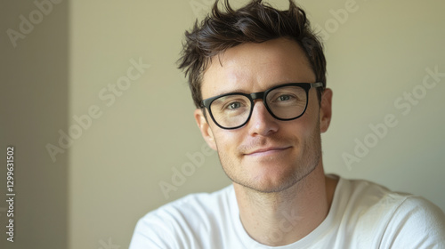A handsome man with black glasses, smiling and looking at the camera, generative AI