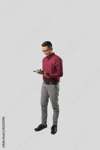 confidence, happiness, posing, promotion, emotion, indonesia, presentation, advertise, finger, copy space, advertisement, gesture, cheerful, device, smartphone, mobile, communication, confident, application, success, education, attractive, professional, portrait, job, freelance, photogenic, isolated, smile, office, businessman, online, happy, holding, adult, notebook, technology, person, work, business, people, cyberspace, computer, laptop, man, asian, male