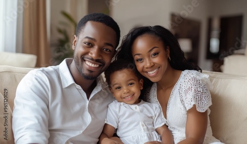 A happy black colored family with two children sitting on the sofa at home, laughing and playing together in the living room. High-quality, realistic photograph.