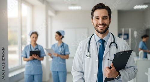 A happy doctor in medical uniform, in a hospital with other nurses, with a little bit of blurred background with side copy space, with background sunshine