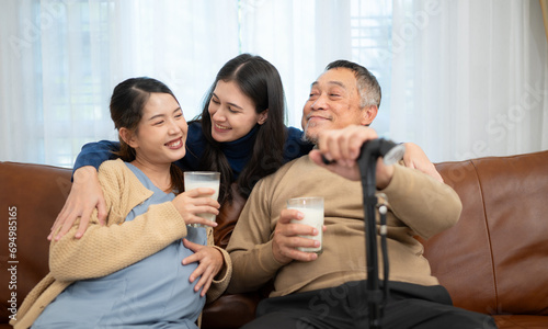 asian, beautiful, beauty, belly, bonding, calcium, care, cheer, children, conversation, daughter, domestic life, drink, elder, elderly, emotional, enjoy, family, father, female, girl, glasses, grandfather, happiness, happy, healthy, home, lifestyle, lifestyle, living, love, male, man, milk, mother, people, portrait, pregnancy, pregnant, relaxation, rest, room, senior, sister, sitting, smiling, sofa, talking, walking stick