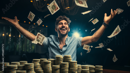 A happy lucky young man threw his hands up in the air as he won at the casino. Flying money bills, on the casino gaming table casino chips for casino and payout of winnings.