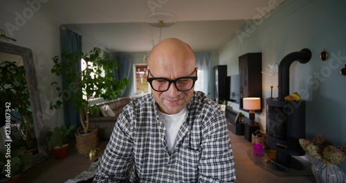 A happy man is talking on a video chat on a laptop. He's sitting at the table at home. Daylight