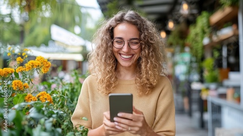 A happy woman with curly hair and glasses using her phone outdoors, representing the blend of connectivity and joy in everyday moments with nature.