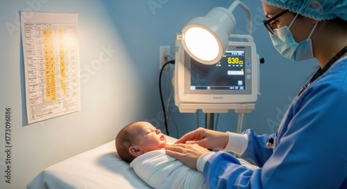 A healthcare professional gently examines a wrapped newborn in a clinical setting, with a bright light illuminating the baby and medical equipment monitoring nearby