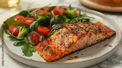 A healthy meal featuring a grilled salmon fish fillet placed next to a vibrant green leafy vegetable salad The salad includes tomatoes