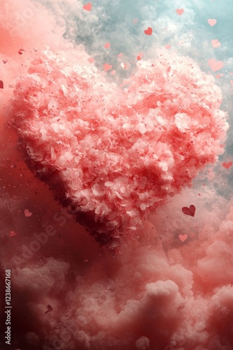 A Heart-Shaped Cloud Of Pink Petals Floats Amidst A Dreamy, Red Smoke.