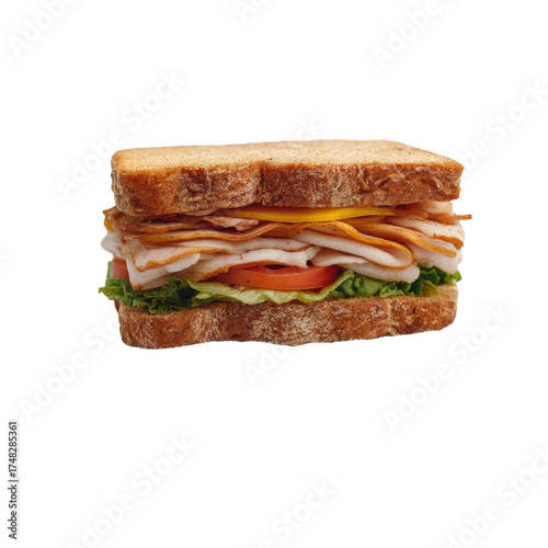 A hearty turkey sandwich with lettuce, tomato, and cheese on whole wheat bread, isolated on transparent background