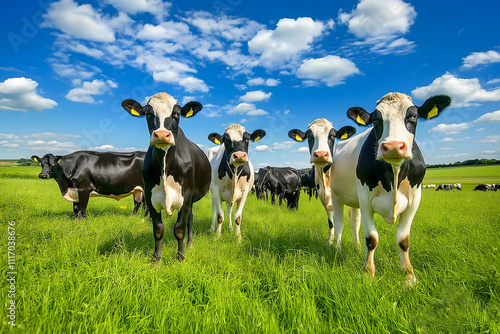 cow, grazing, herd, pasture, green, serene, blue, sky, cloud, nature, rural, landscape, agriculture, farm, meadow, field, countryside, daylight, cow, cattle, animal, dairy, black, white, milk, farming, peaceful, sunny, farm animal, animal, bovine, grass, scenery, summer, idylli, open, horizon, environment, natural, farmland, calmness, beauty, lush, lifestyle, clean, eco