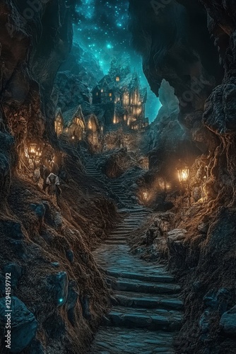 cavern, kingdom, plant, elf, coexistence, fantasy, underground, street, lighting, cobbled, magical, aethereal, nature, culture, illumination, adventure, harmony, civilisation, enchanting, whimsical, secret, community, flora, fauna, exploration, mythology, storytelling, art, architecture, lifestyle, colours, tranquil, vibrant, ecosystem, friendship, craft, heritage, mystical, landscape, diversity, oneness, creativity, character, discovery