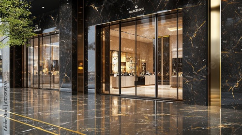 A high-end retail store with floor-to-ceiling display windows and a facade of polished, black marble with gold trim