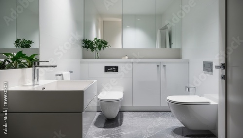 a highly detailed, hyper-realistic, cinematic photograph of a sparkling clean, organized, and minimalist bathroom, with gentle, softbox lighting