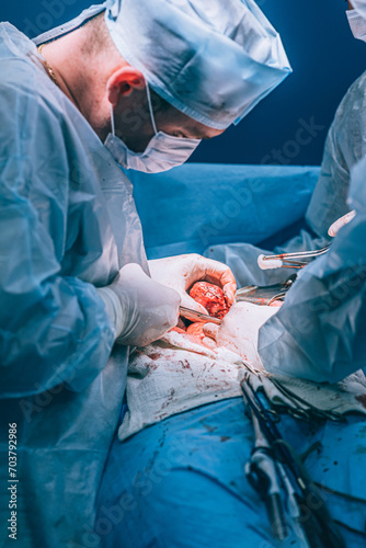 A highly qualified team of surgeons performs a complex operation to remove a pancreatic cyst using medical instruments