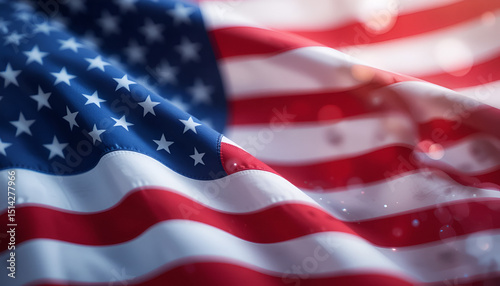 "A high-resolution background featuring the American flag waving gently, with a soft-focus bokeh effect in red, white, and blue. Includes subtle stars and stripes overlay. Ideal for patriotic holidays