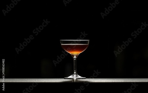 A high-resolution stock photo of an old-fashioned cocktail in a glass, placed on a bar counter with a black background.
