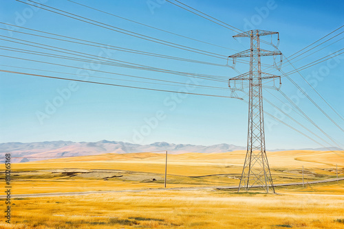 A high-voltage power line tower with thick cables stretching across a vast landscape under a clear blue sky.