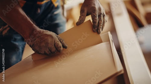 A Hispanic construction worker installing drywall sheets. Featuring focus and teamwork