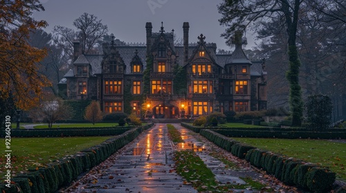 luxury home, dusk, illumination, pathway, autumn, foliage, architecture, historic, garden, tree, evening, landscape, front view, reflections, exterior, nature, gothic, residential, opulence, calmness, symmetry, shadow, detail, elegant, serenity, outdoors, park, leaf, atmospheric, quaint, romantic, heritage, property, estate, grandeur, evening sky, scenic, peaceful, tranquil, luxury, brick, stone, environment, twilight