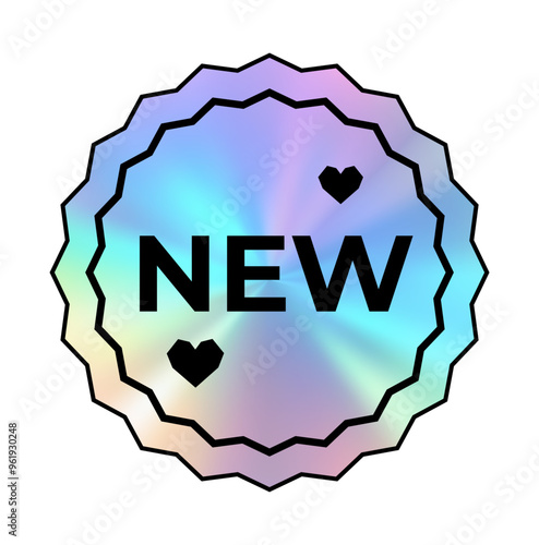A holographic sticker in the shape of a multi-pointed star with lettering and hearts. Full vector, cut out, clip art