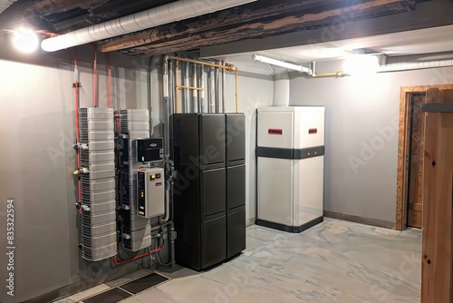 A home energy storage (HES) system with batteries in a basement, providing backup power and reducing reliance on the grid.