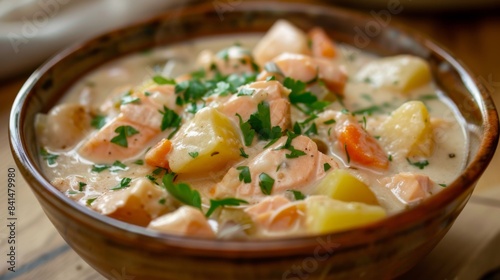 A homemade bowl of creamy salmon chowder, filled with chunks of tender fish, potatoes, and vegetables, perfect for a comforting meal on a chilly day