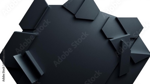 A hyper realistic image of a modern dark-toned wall with geometric shapes, perfect for electronic music, games, virtual reality concepts, isolated on white background, design aesthetic