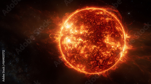 A hyper-realistic close-up of a massive burning sun in the dark expanse of space, its surface alive with swirling solar flares and erupting prominences, glowing in intense hues of fiery orange.