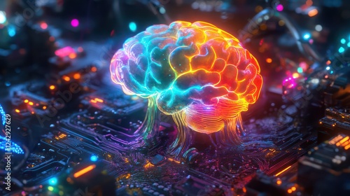 A hyper-realistic glowing brain with swirling neural pathways in rainbow colors, positioned above a dense