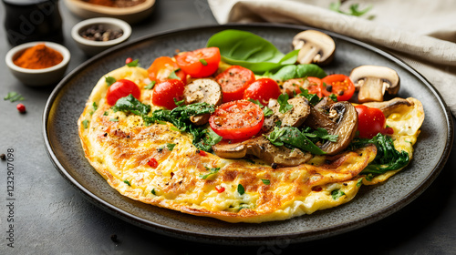 omelet, champignon, pepper, tomatoes, spinach, spice, ceramic, plate, concrete, grey, napkin, linen, background, bowl, culinary, epicure, detailed, presentation, vibrant, rustic, fresh, aromatic, delectable, showcase, natural, ingredient, artistic, realistic, scene, centrepiece