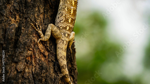 A Indian brown Chameleon (Girgit) resting on tree branch. A wild lizards sitting and climbing on the Gum arabic tree (kikar) Blur and sunset background. Little speckled black dots tail