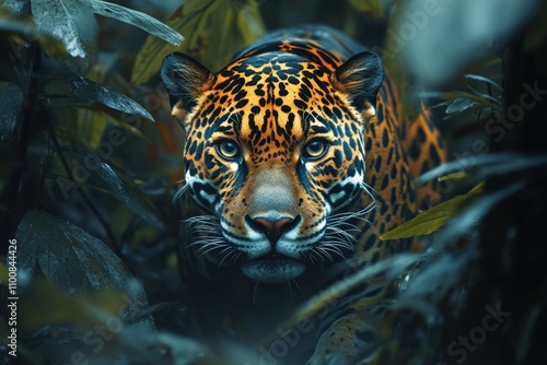 A jaguar with piercing blue eyes stares intently at the camera from behind a wall of lush foliage, with a dark and moody background.
