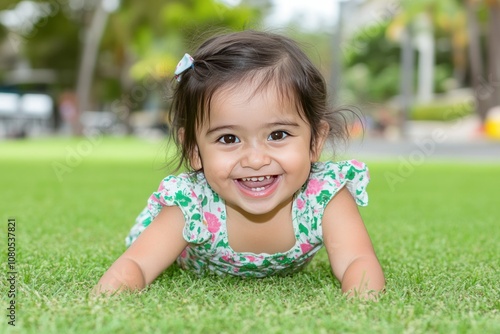 A joyful child crawling on grass, smiling brightly in a playful outdoor setting.