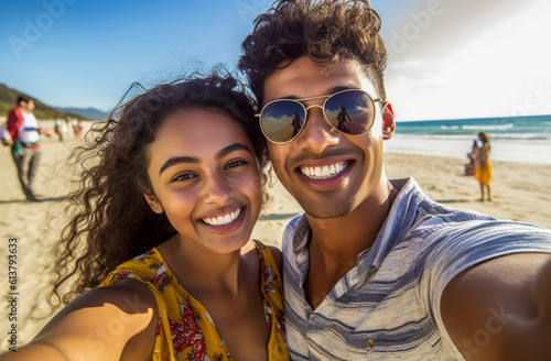 A joyful Indian couple captures their love and happiness at the beach, taking a sunny selfie on a summer day. Generative AI