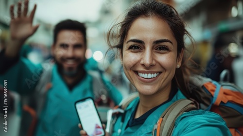 A joyful selfie of smiling healthcare professionals in scrubs, radiating positivity and teamwork amidst a bustling environment filled with purpose and dedication to their duties.