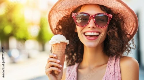 A joyful woman wearing a pink hat and sunglasses, delightfully enjoying her ice cream cone on a sunny day.